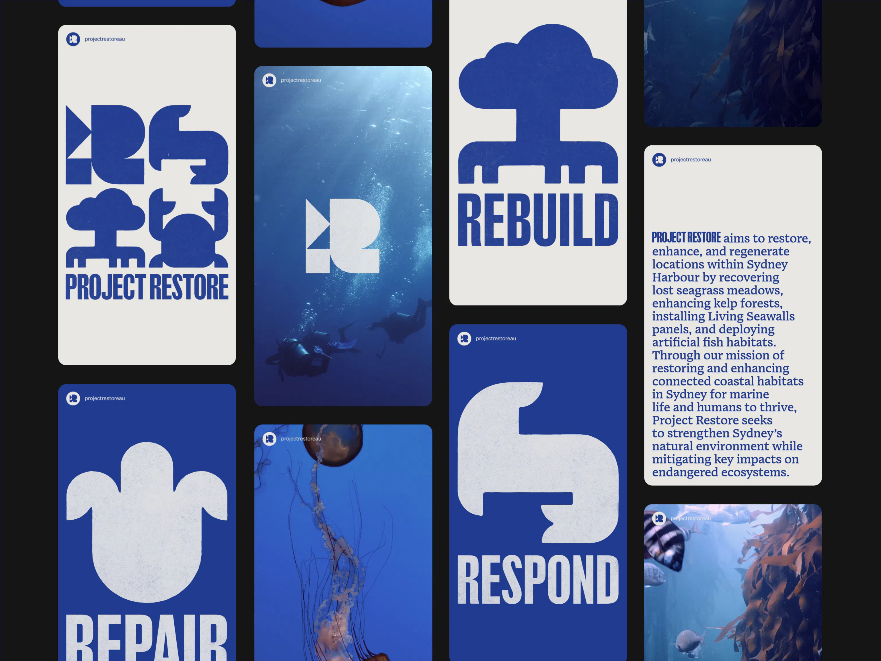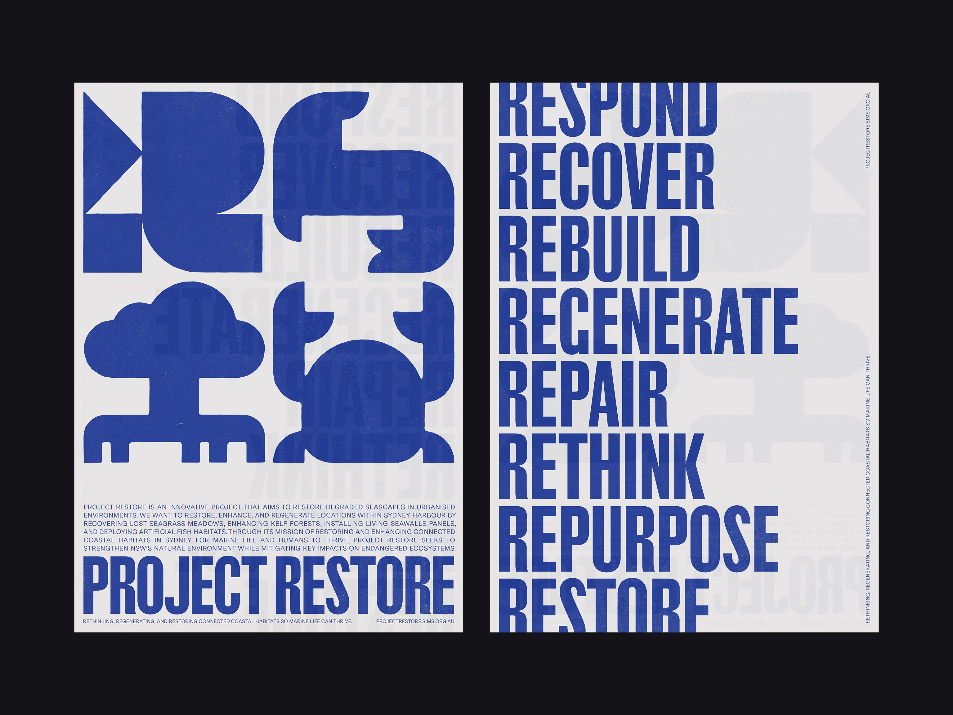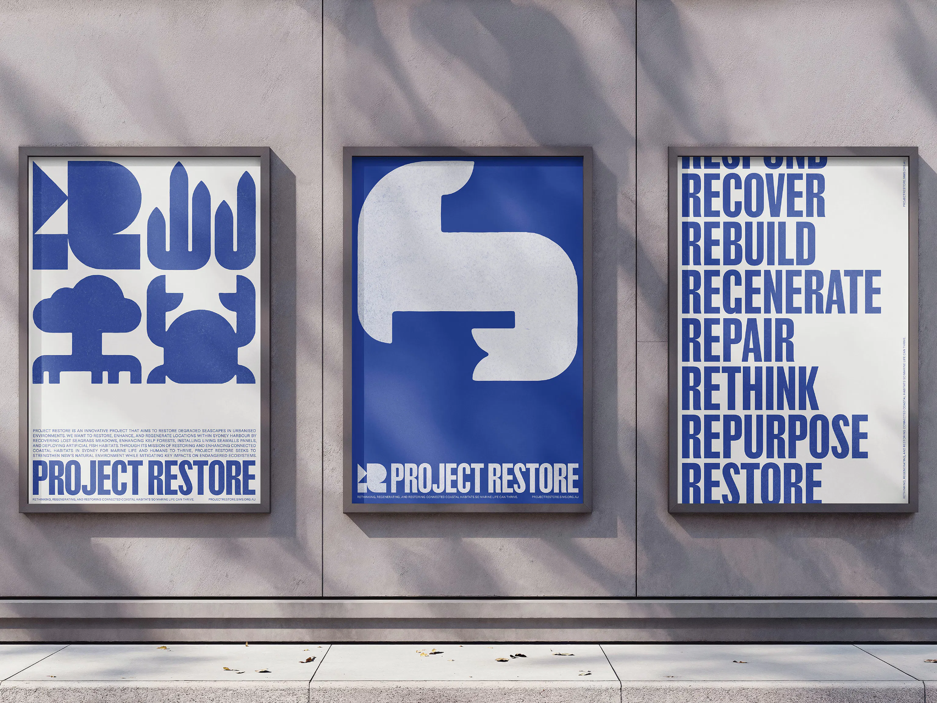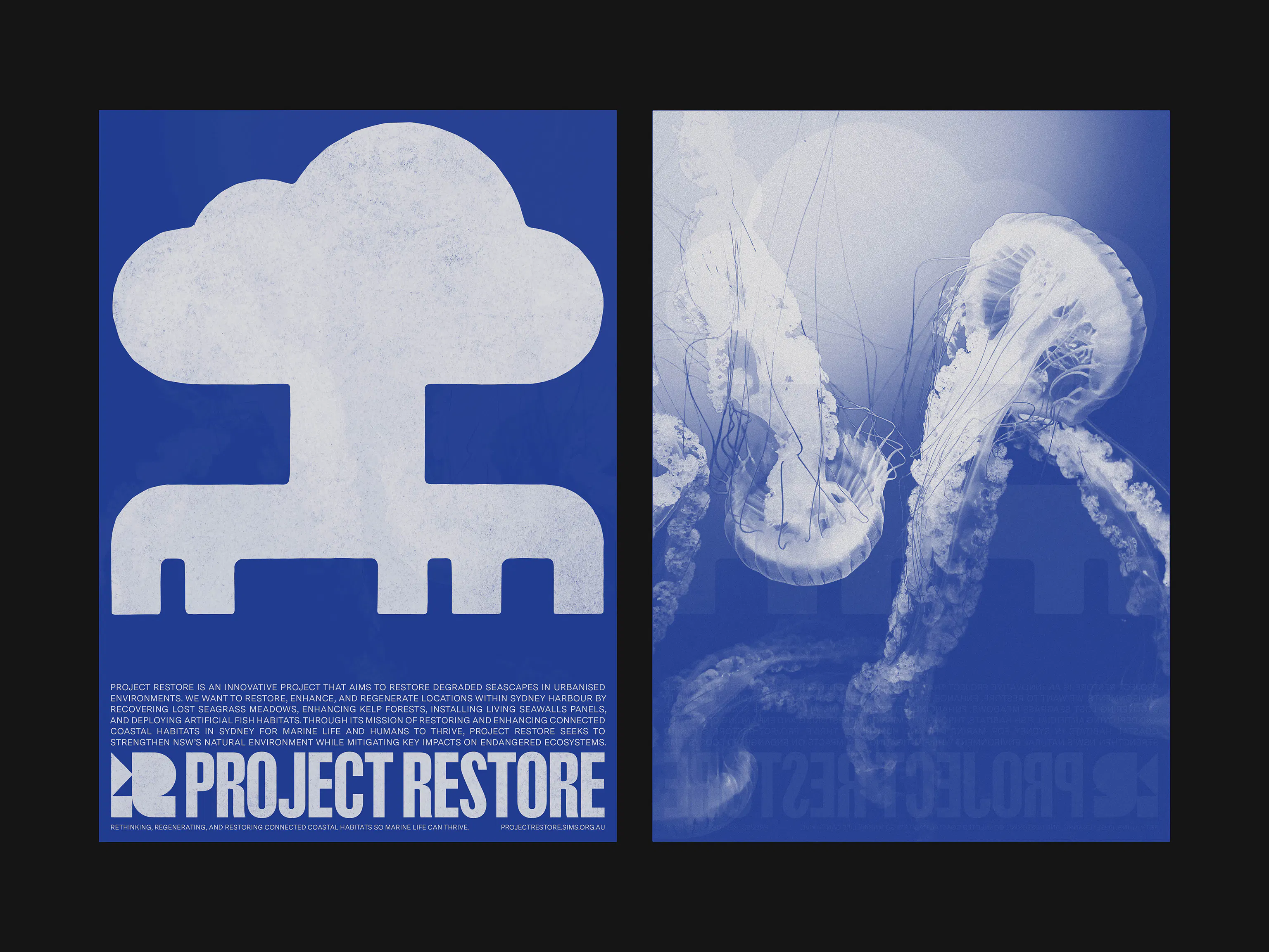 Project Restore is an ocean restoration group rehabilitating degraded seascapes in urbanised environments across Sydney Harbour. We were engaged to develop a versatile visual identity that establishes the project as accessible, educational, and environmentally aware.
