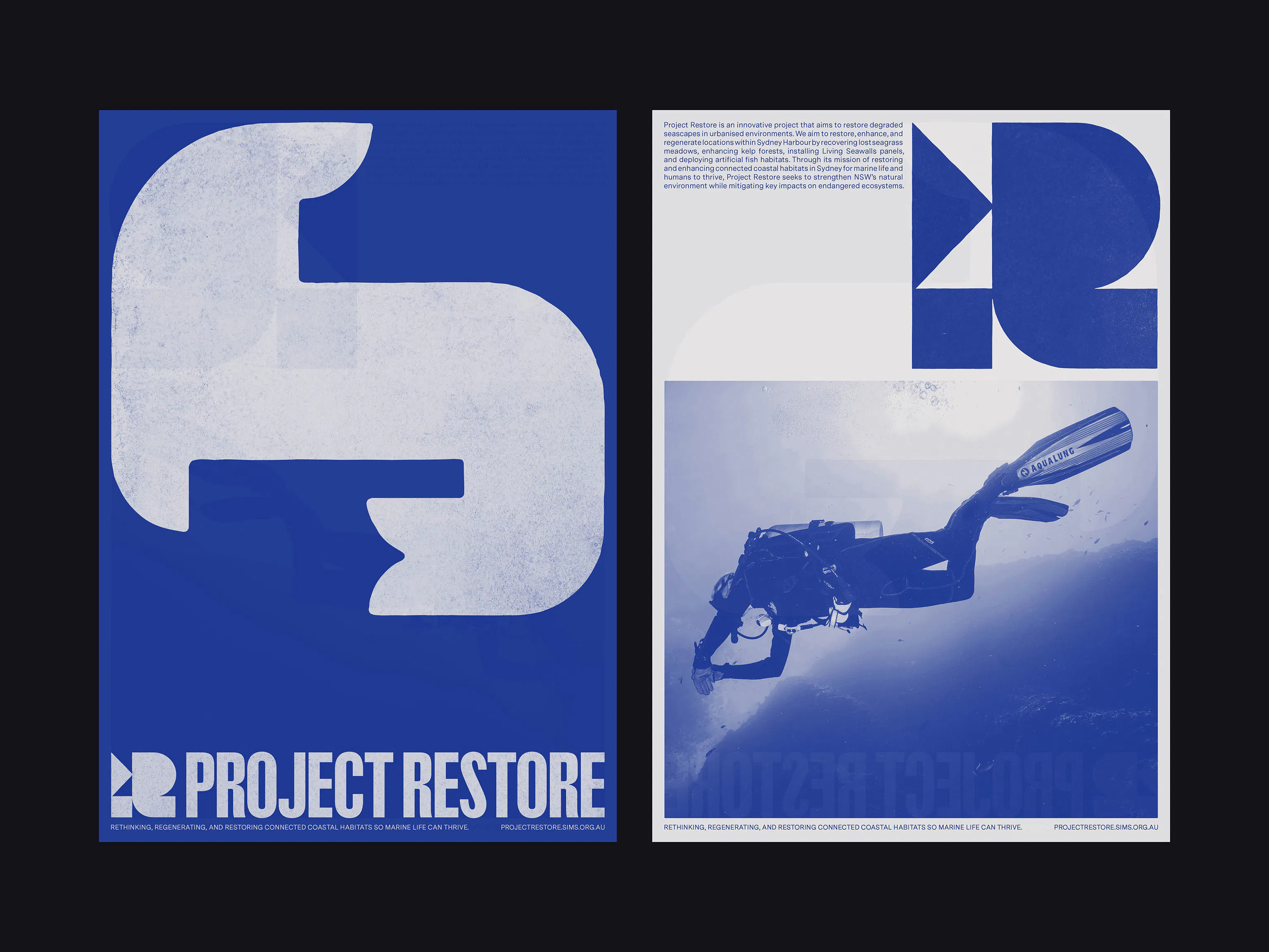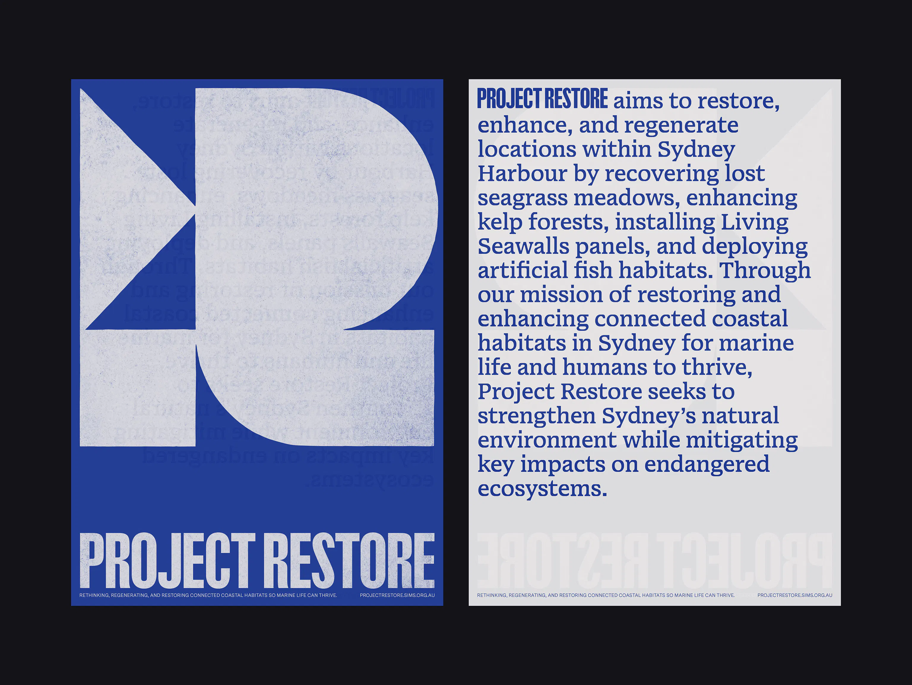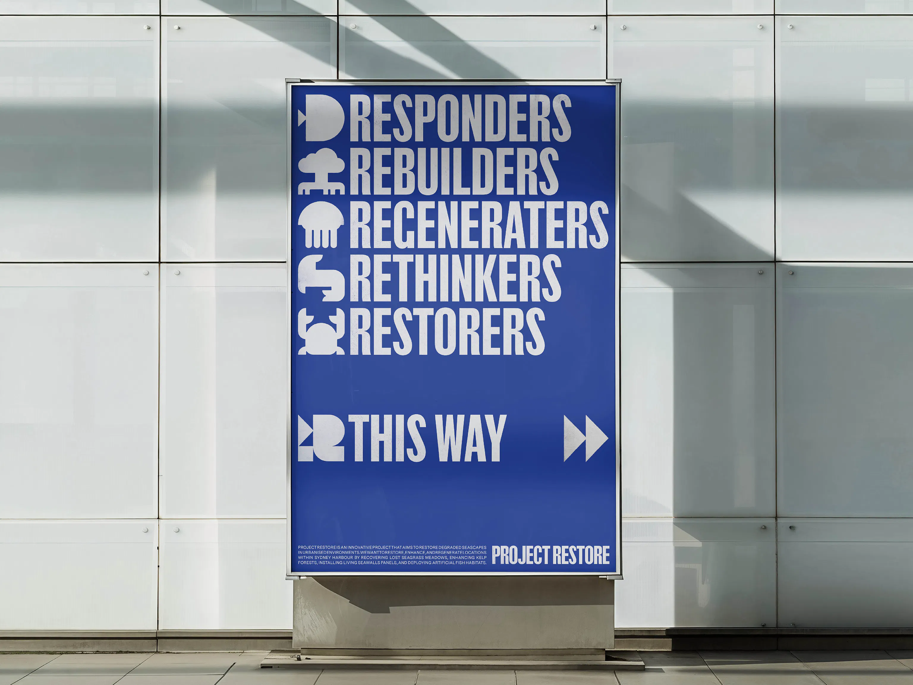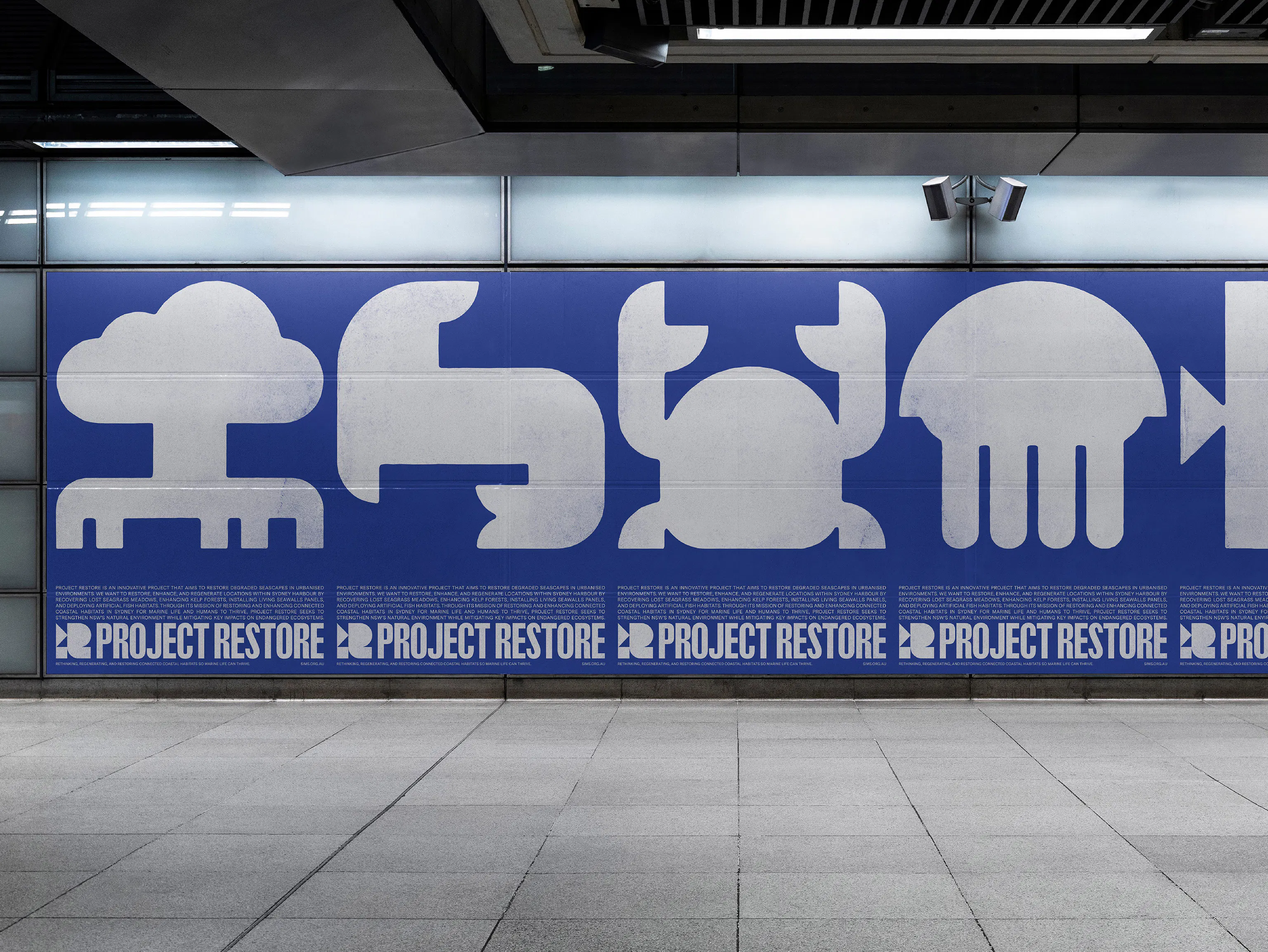 Project Restore is an ocean restoration group rehabilitating degraded seascapes in urbanised environments across Sydney Harbour. We were engaged to develop a versatile visual identity that establishes the project as accessible, educational, and environmentally aware.